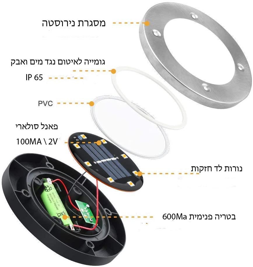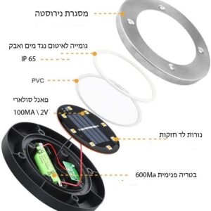 המנורה הסולארית עמידה למים, אבק ומזג אוויר קשוח ברמה IP65 אשר מאפשרת למנורה לעבוד כרגיל גם בימי חורף או קיץ קשים, הדיסק העליון של התאורה הסולארית בחצר עשוי מנירוסטה אל חלד כך שהוא גם חזק וגם מונע חדירת מים ללא בלאי בעקבות חלודה.